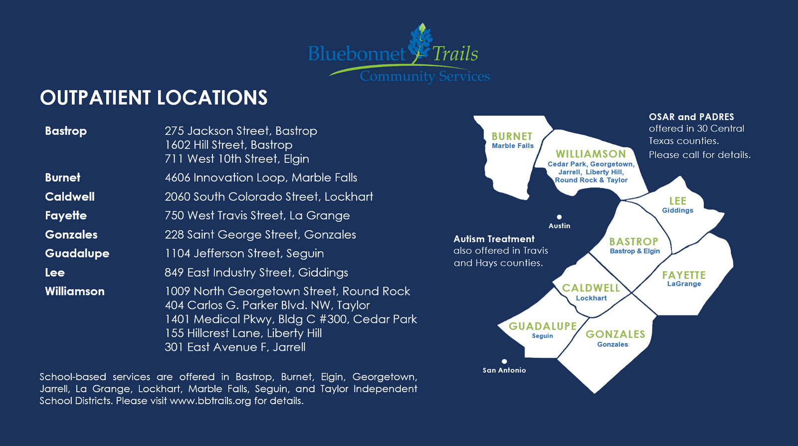 Bluebonnet Trails Community Services Board and Staff assure access to a comprehensive array of services strengthening individuals and families throughout a lifetime.